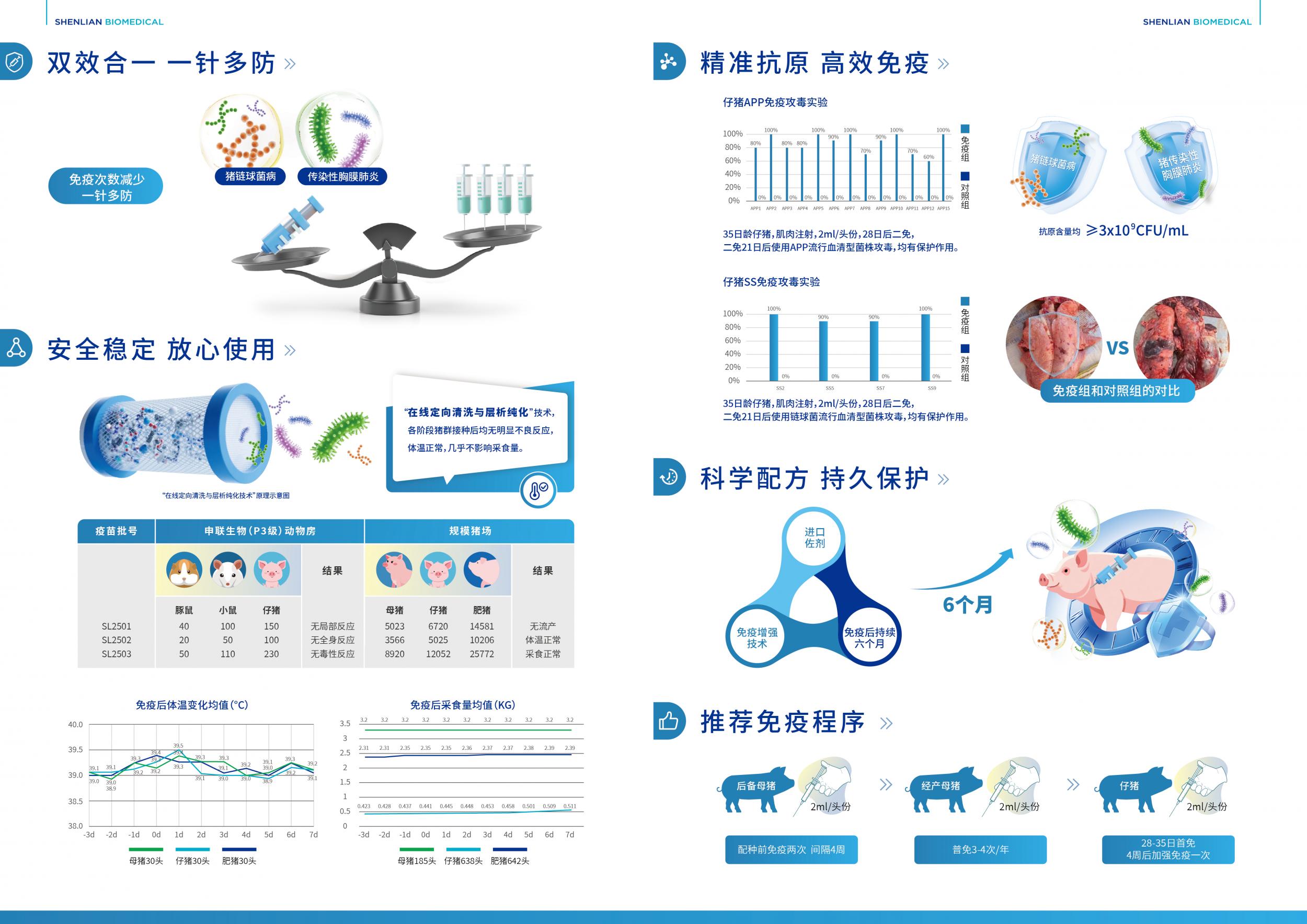 面对当前猪场细菌性疾病混合感染高发、抗生素效果受限的挑战,本品突破传统单苗局限,可同步防控两种重大疫病,显著降低免疫次数、减少猪群应激,有效解决防疫成本高、免疫程序复杂的行业痛点。其采用的低粘度油包水佐剂在提升免疫效果的同时,通过高效纯化工艺显著降低了副反应,真正实现了“高效低耗、安全无忧”的防控目标。